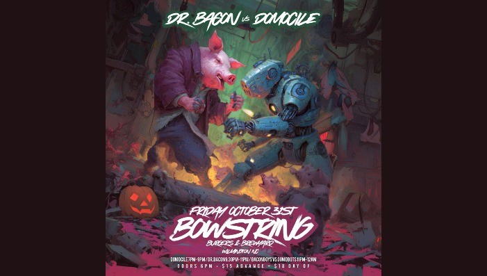 But wait—the real horror show peaks when these two titans collide! From **11 PM to midnight**, “BaconBoys vs. DomoBots” erupts in an epic team-up battle, blending Domocile's robotic riffs with Dr. Bacon's bacon-fueled fury for one massive, sweat-soaked finale that'll rattle the rafters and haunt your dreams.