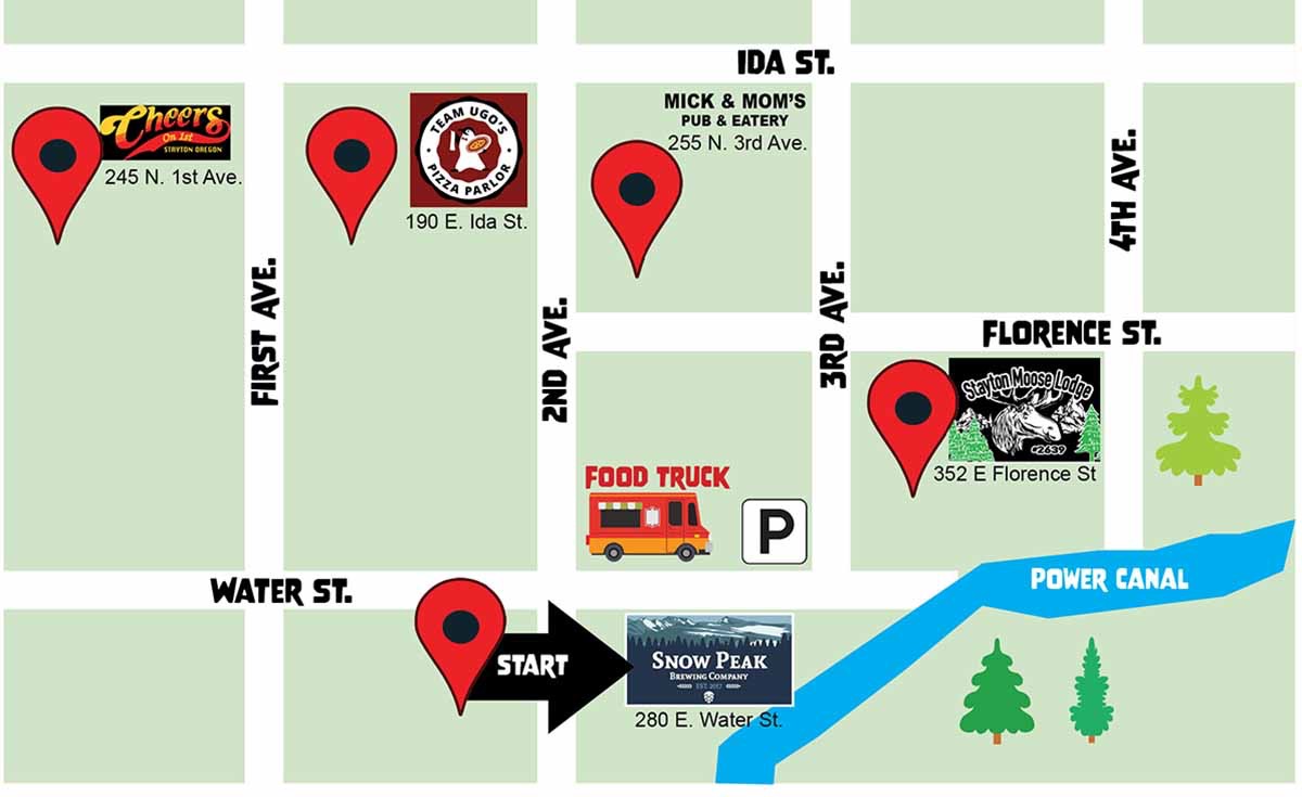 Participating businesses include Snow Peak Brewing Co., Cheers on First, Mick & Mom's Pub, Stayton Moose Lodge, and Ugo's Pizza. Drink and food specials will be featured at each establishment.